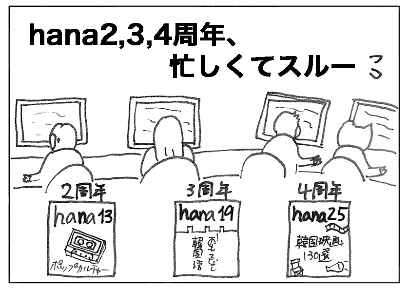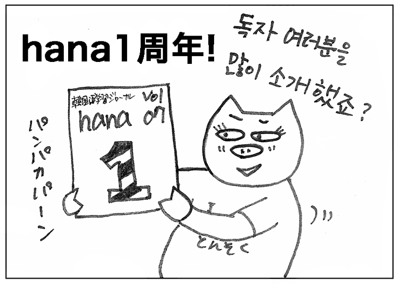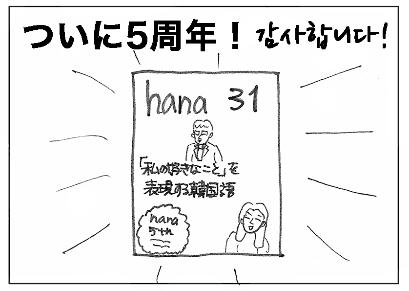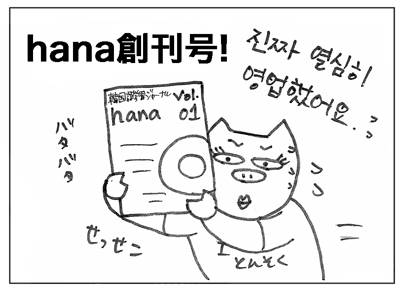 +Booksとんそく子の4コマ漫画「とんちゃん劇場」38ー『韓国語学習ジャーナルhana』5周年!ー 2025/09/21※このコーナーは、『韓国語ジャーナル hana』の定期購読者に送付されている会報誌『hana通信』(2019年5月発行)の「とんちゃん劇場」を再編集したものです。『韓国語学習ジャーナルhana』5周年!訳:マジで一生懸命営業しました読者の皆さまをたくさん紹介したんですよありがとうございます とんそく子5周年の頃は書店営業に駆け回っていた私も、今はHANAスクール担当に。学習者の学び方もずいぶん変わったなぁと実感しています。これからも、時代に合った方法で韓国語学習をサポートしていきたいですね。「とんちゃん劇場」をもっと読む 152SHARE この記事の執筆者 115 記事とんそく子 『hana』編集長/広報担当【 浅見綾子(あさみあやこ)】 大学院在学中に韓国のソウル大学語学堂に半年、聖公会大学にも交換留学。修士課程修了後、韓国の語学教材の出版社に5年勤務し、帰国後4社目のHANAで落ち着く。2020年に営業から編集に異動。編集という仕事の大変さを知り、これまで営業の立場で生意気な口をきいてごめんなさいと日々反省。2025年からはスクールの運営担当に。口癖は「あれ、えーっとあれ」。 とんちゃん劇場 前の記事 【韓国語のエッセイ】2025年8月月間ベストセラー&新刊情報 次の記事 【韓国の小説】2025年7月月間ベストセラー&新刊情報
