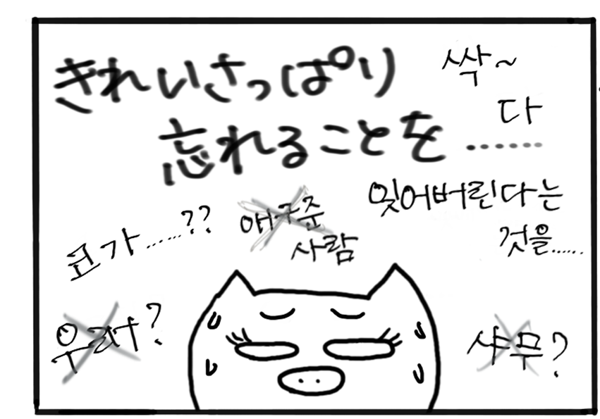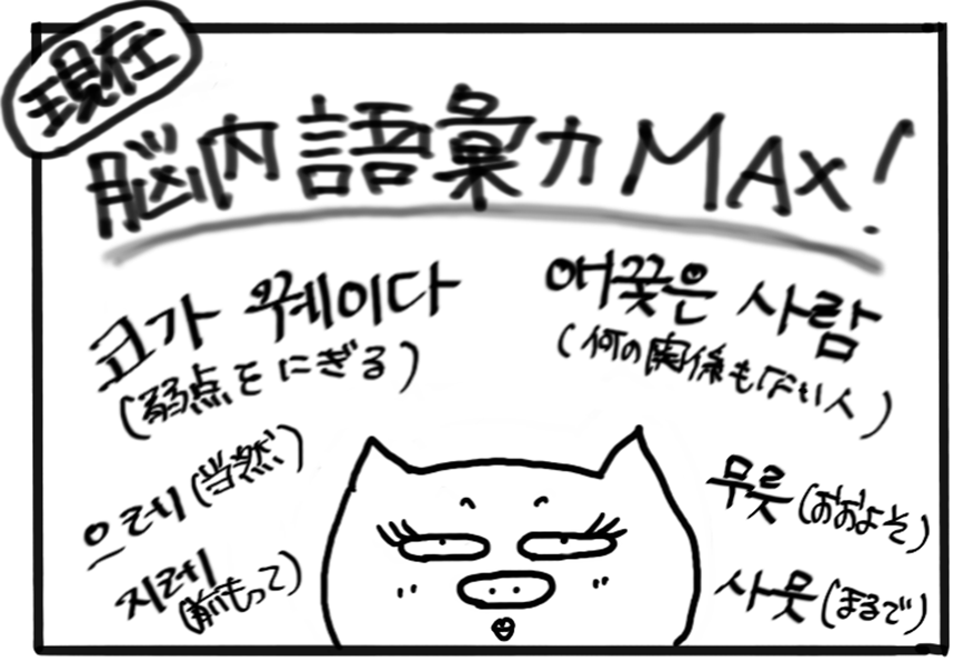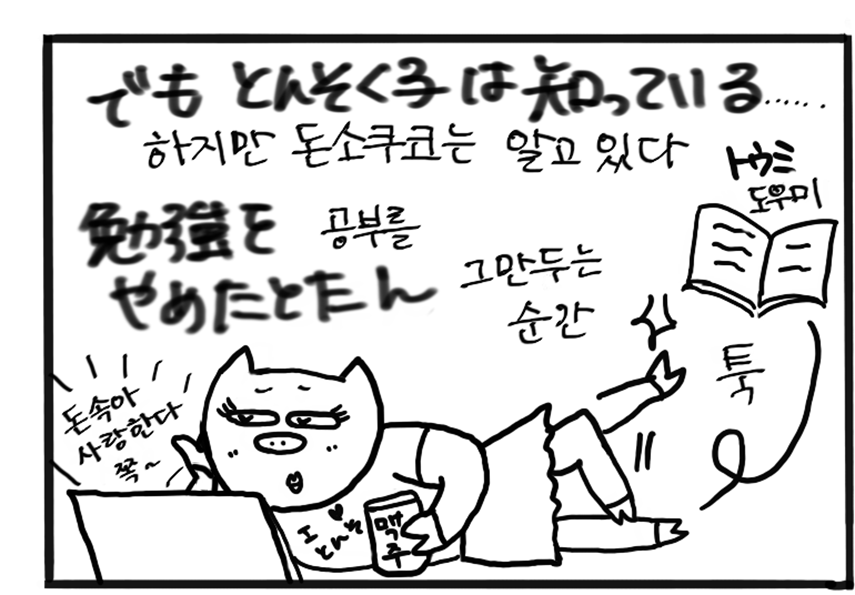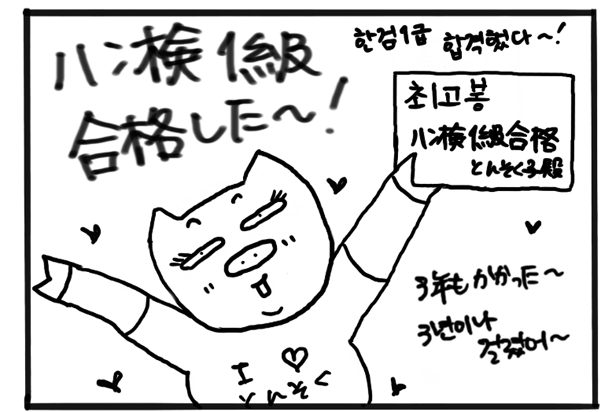 +Booksとんそく子の4コマ漫画「とんちゃん劇場」49ーつ・い・に!ー 2026/02/22※このコーナーは、『韓国語ジャーナル hana』の定期購読者に送付されている会報誌『hana通信』(2020年12月発行)の「とんちゃん劇場」を再編集したものです。つ・い・に!とんそく子コメント とんそく子ハン検1級合格を目標にしていた頃は、語彙力強化のために本当に毎日コツコツ頑張ってました。……が!目標を達成した瞬間、人間ってダメですね。あの情熱はどこへやら。「また受けなきゃ」と思い続けて、気づけばもう5年。「とんちゃん劇場」をもっと読むSHARE この記事の執筆者 143 記事とんそく子 『hana』編集長/広報担当【 浅見綾子(あさみあやこ)】 大学院在学中に韓国のソウル大学語学堂に半年、聖公会大学にも交換留学。修士課程修了後、韓国の語学教材の出版社に5年勤務し、帰国後4社目のHANAで落ち着く。2020年に営業から編集に異動。編集という仕事の大変さを知り、これまで営業の立場で生意気な口をきいてごめんなさいと日々反省。2025年からはスクールの運営担当に。口癖は「あれ、えーっとあれ」。 とんちゃん劇場 前の記事 『韓国語でちょっといい話』(ちょっといい話製作委員会編、朴鍾厚訳・再話|アルク刊)
