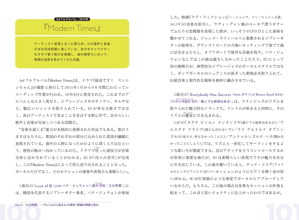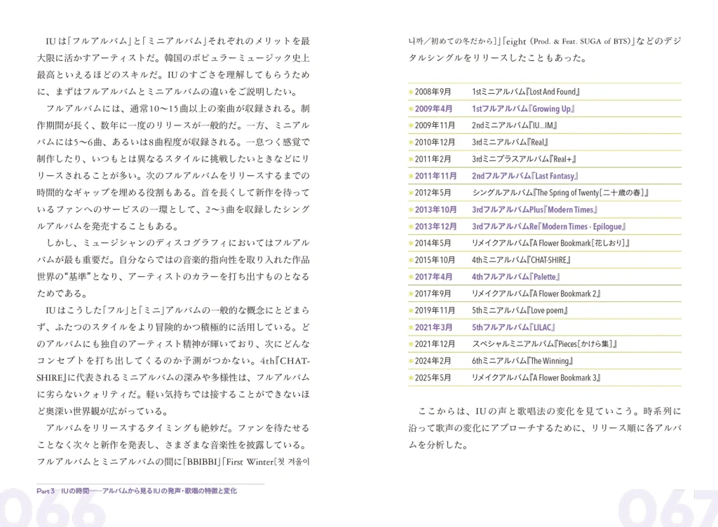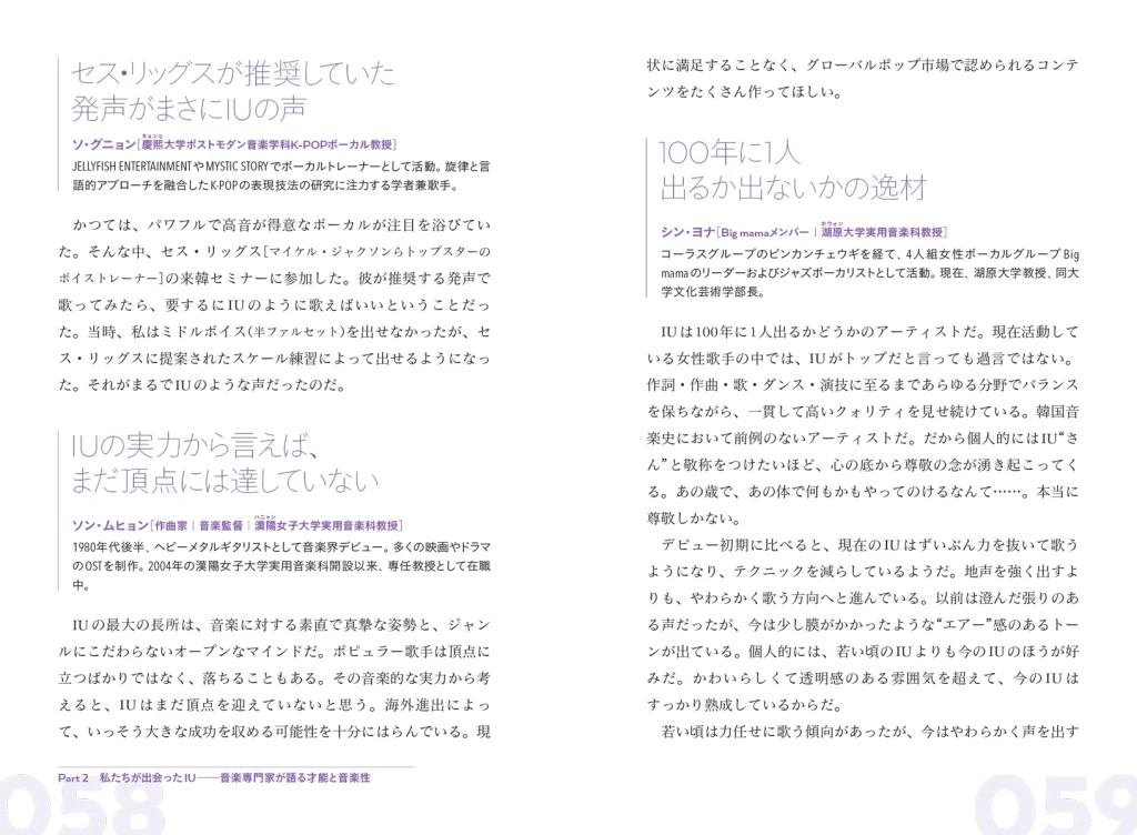 本書『IUを読む時間』では、IUの楽曲を一曲ずつ丁寧に解説し、その歌唱表現や感情の込め方、マイクの使い方に至るまでを徹底分析。