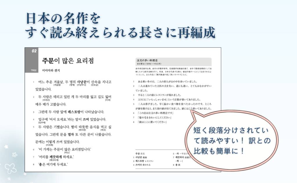 国語教科書で親しんだ日本の名作文学を、学習者のために“やさしい韓国語”でリライト。読みやすさと文学の面白さを両立させた、多読・多聴に最適な作品集です。