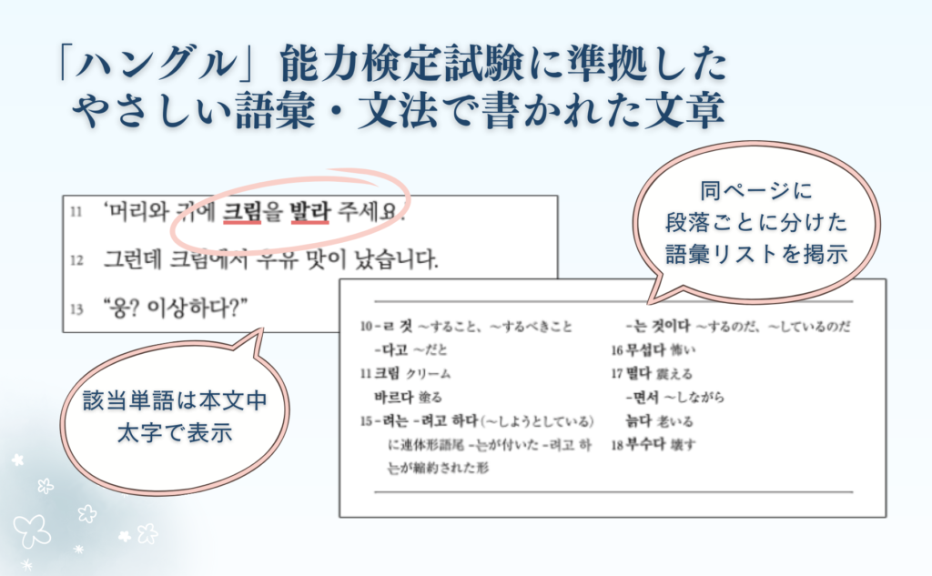 本書の作品は、「ハングル」能力検定試験の出題語語彙リストに沿って単語や文法を制限して書かれています。第1章では初級レベルに当たる4・5級、第2章では3級までの語彙・文法を主に使用しています。それより上のレベルの語彙や文法には注を付けました。