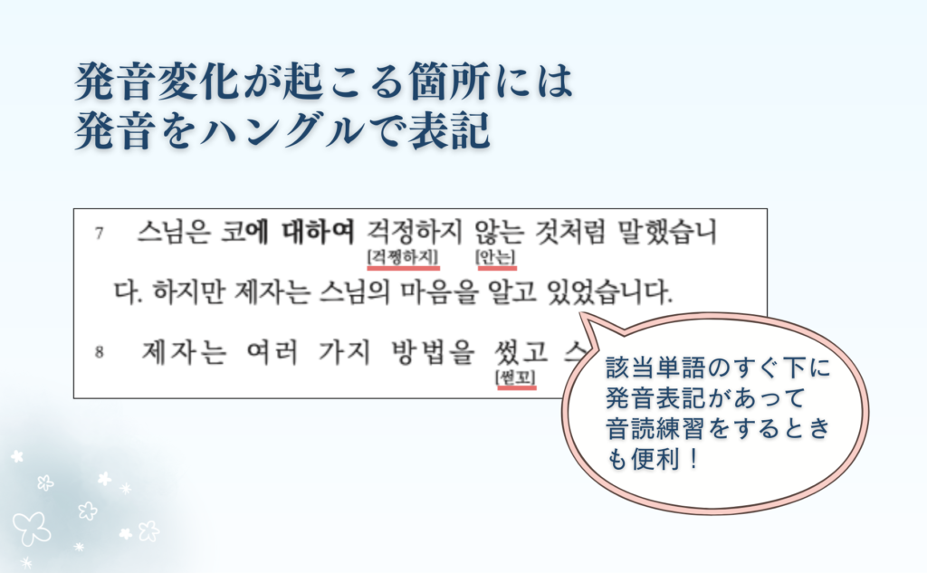 韓国語の発音変化は学習者にとってはなかなかの難関です。本書の文章で発音変化が起きる部分には、ハングルの発音表記を添えることで発音変化を把握しやすくしました。