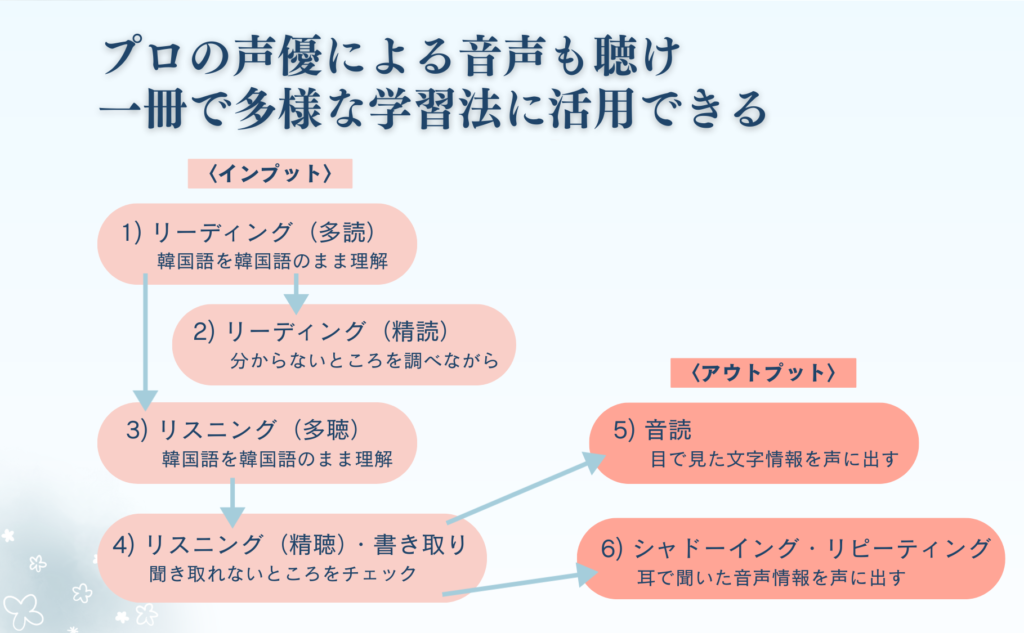 本書の音声は、韓国人の声優がゆっくり丁寧に読み上げており、初級学習者のリスニングに最適です。また、本書はリーディングのための素材集として作られましたが、リスニングや音読、シャドーイングなど韓国語の練習にもご活用いただけます。