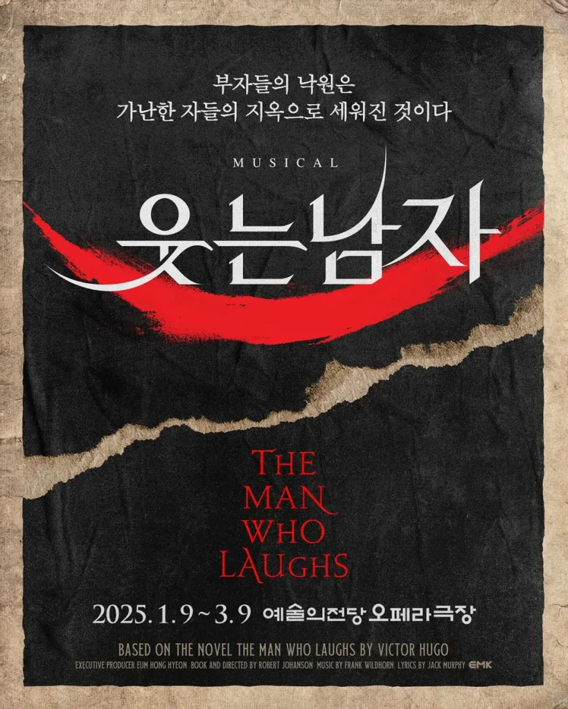 身分差別がひどかった17世紀の英国、子どものころ誘拐され、口の両端を切られて捨てられた그윈플렌(グウィンプレイン)は、盲目の少女데아(デア)と共に、行商人である우르수스(ウルシュス)に救われ、旅芸人になります。しかし、ある貴族夫人と出会い、そして自分の身分を知ることで彼の人生は大きく変わってしまいます……。