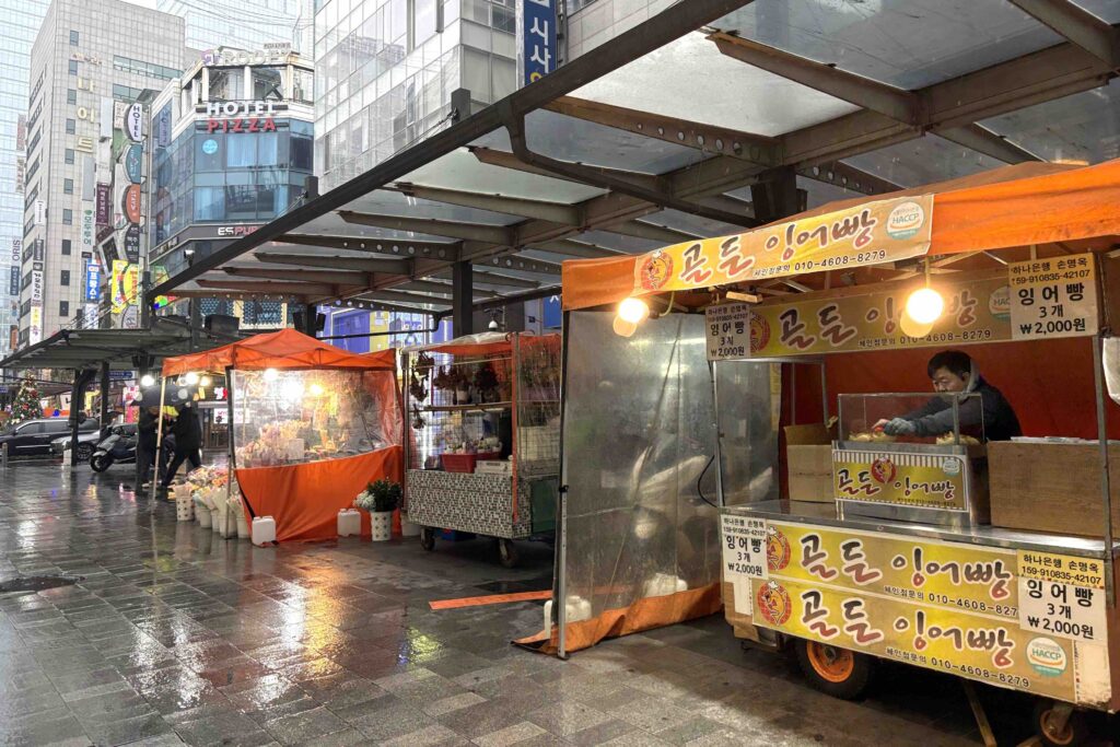 ピアノの鍵盤が地面に描かれていたことから「피아노거리(ピアノ通り)」と呼ばれていたこの通り。今は「젊음의 거리(青春通り)」という名に変わったのだそう。 青春通りには屋台がちらほらとありました。なかには花を売る屋台も。