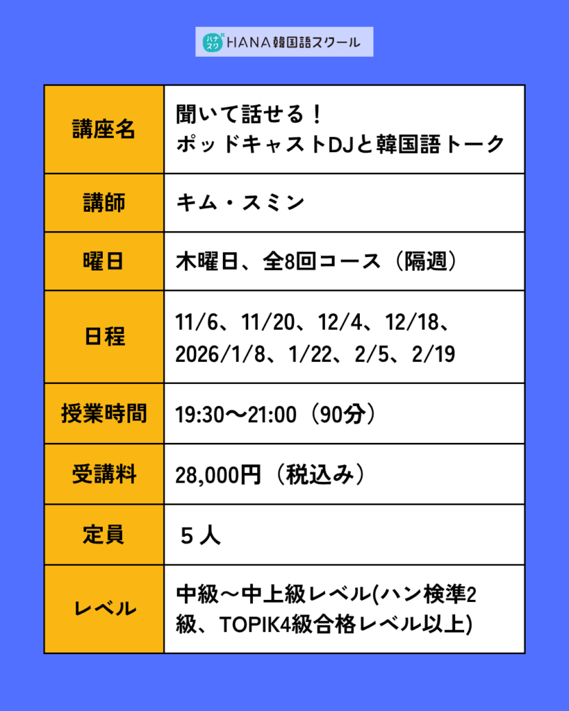 🎧 聴いて話せる!ポッドキャストDJと韓国語トーク〈全8回〉