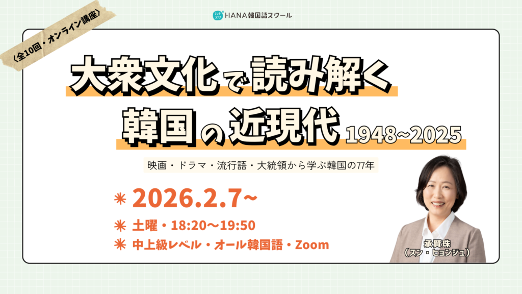 韓国の映画、ドラマ、流行語、ヒット商品、ニュース。“あの時代”の韓国では、何が人々の心を動かしていたのでしょうか。 この講座では、1948年~2025年までの韓国を、政治ではなく“大衆文化”を入口にして読み解きます。 こ … 続きを読む 【2月7日開講】大衆文化で読み解く韓国の近現代1948-2025〈全10回〉
