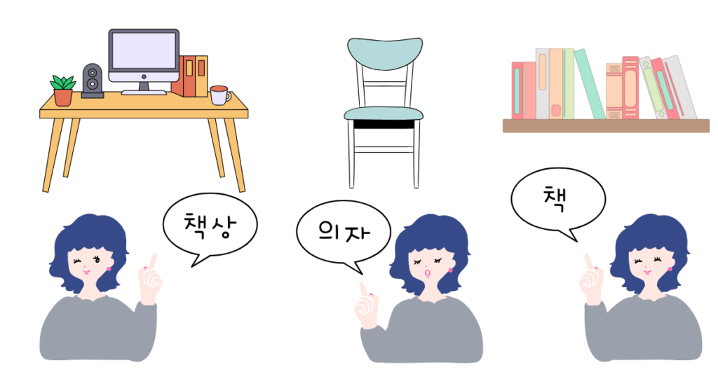 例)机→책상、椅子→의자、本→책