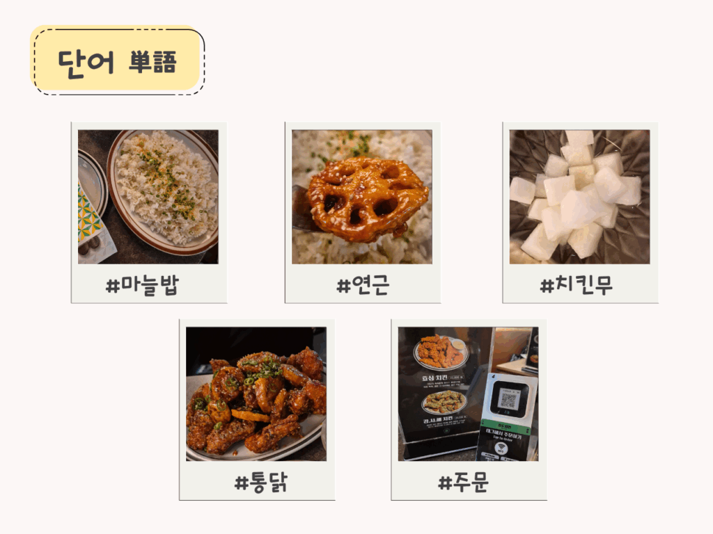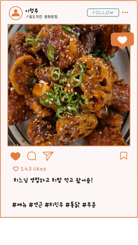 韓国語の통닭は、文字通り통(丸ごと)+닭(鶏)という意味です。この名前の由来は、鶏一羽をまるごと調理することから来ています。つまり、丸ごとの鶏をそのまま揚げたり焼いたりした料理を指すのです。 - 주문:注文