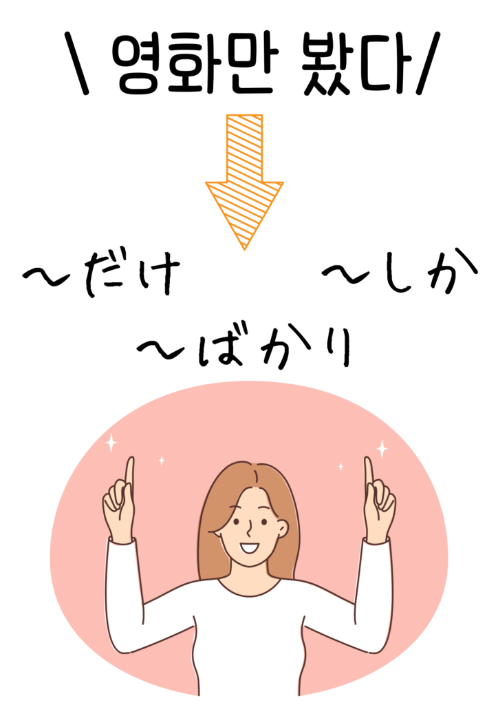 ここまで、영화만 봤다という例を使って「~だけ」「~ばかり」「~しか(~しない)」という3通りの訳し方を見ました。「他の選択肢がない」「他の選択肢を選ばない」という意味は、どれも共通しています。