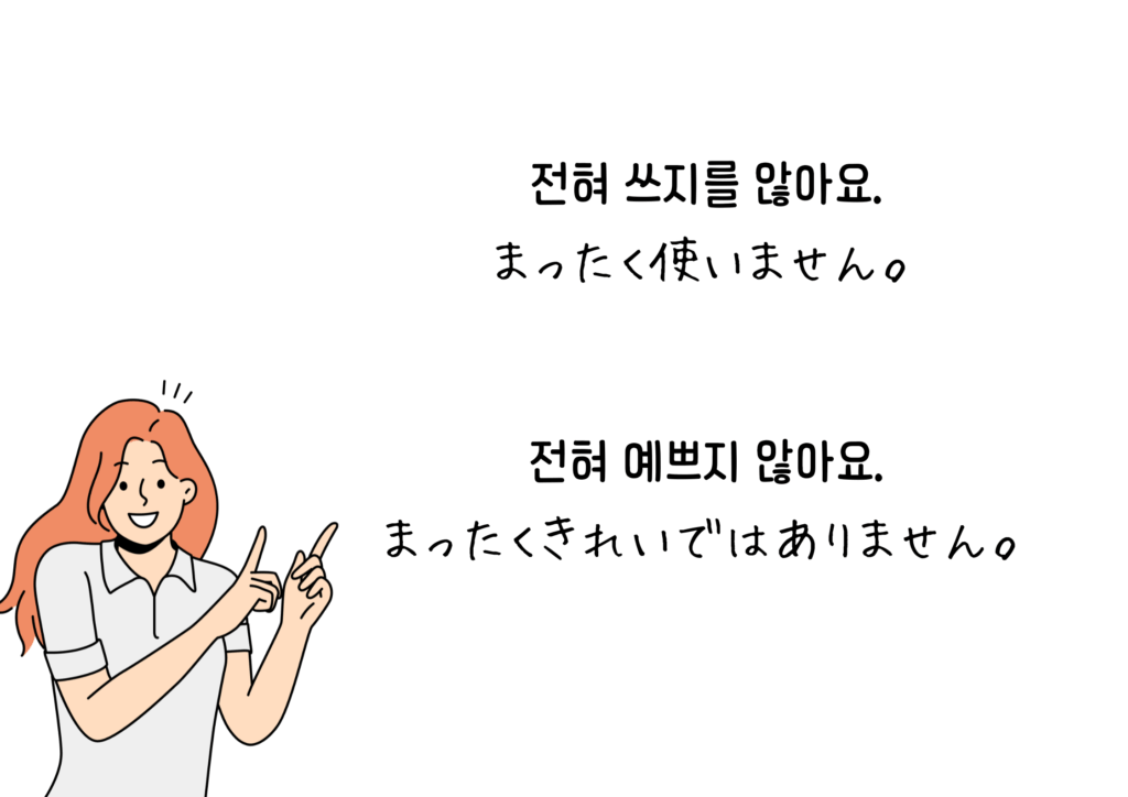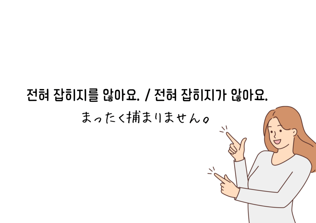 否定形に助詞を挟むとき、~는や~도の挟み方は上で見た通りですが、他にも否定形には~를、~가を挟むことができます。これらを挟んで–지를 않다、–지가 않다とすると、否定の意味を強めて「なかなか~しない」「絶対に~ではない」などのニュアンスを持たせることができます。