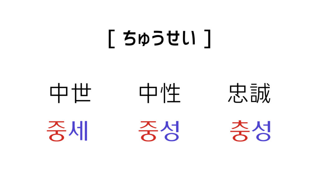2種類の「中、忠」の[ちゅう]は韓国語の読みが중、충の2種類で、3種類の「世、性、誠」の[せい]は韓国語の読みが세、성の2種類です。