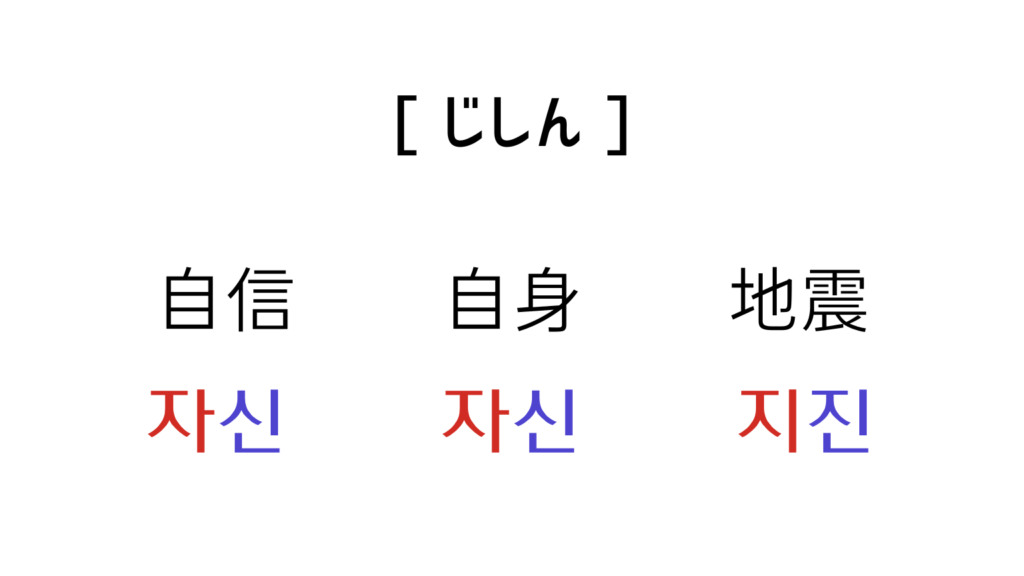 2種類の「自、地」の[じ]は韓国語の読みが자、지の2種類で、3種類の「信、身、震」の[しん]も韓国語の読みは신、진の2種類です。