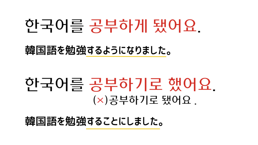 ところで、ほとんどの学習者が~게 되다は正しく表現しますが、なぜか不思議にも~기로 하다を~기로 되다と話したり書いたりする学習者が意外と多いです。