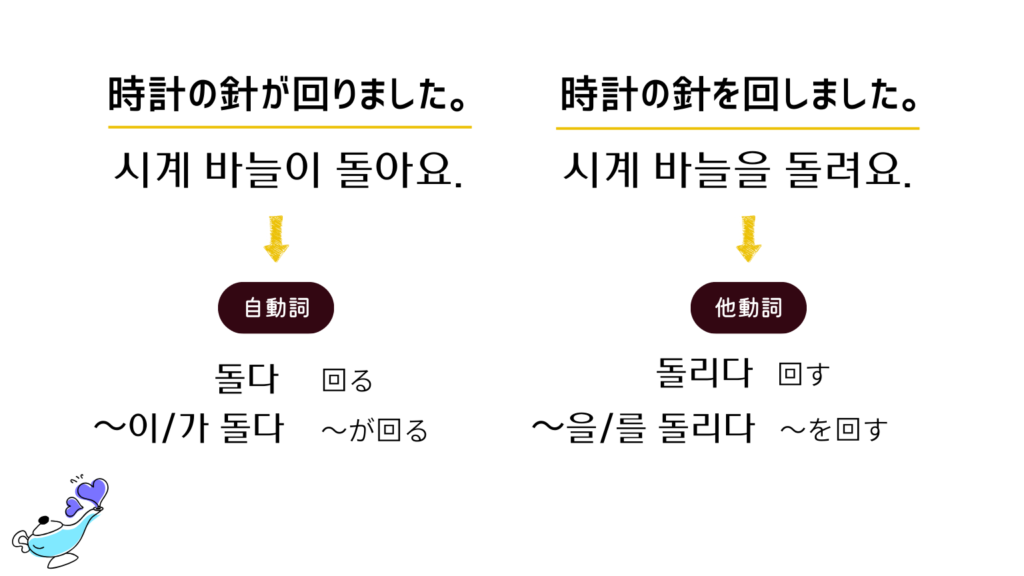 自動詞と他動詞をしっかり身に付けて、より豊かな韓国語表現ができるように一緒に練習していきましょう。