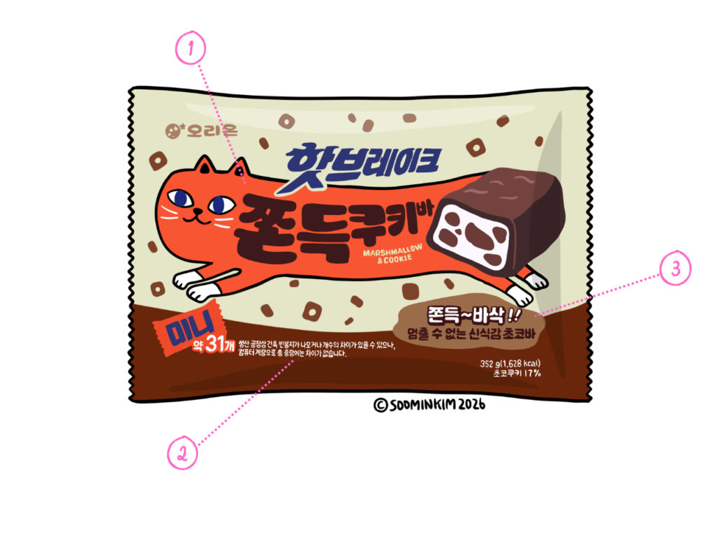 商品パッケージの韓国語には、そのお菓⼦がどんな味で、どんな成分が⼊っているのかといった内容はもちろん、⽣きた⽇常表現と実⽤的な⽂法が込められています。